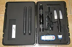 Ideal for quality control and incoming goods inspections, this multipurpose air humidity meter comes with short and long insertion needles as well as 3 different external electrodes (ramming, penetrating, paper). Self-test or pre-set measuring modes based on material type are available from the user friendly navigation menu, as are temperature compensation, maximum / minimum value, LCD backlight and dry-moist-wet indicator settings. An easy-to-read display shows digital and bar graph values on screen. Moisture % displayed is material moisture with respect to dry mass (e.g., 100 % material moisture for 1 kg of wet wood = 500 g water).