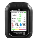 Indoor / Battery-powered multi-function particle counter / LC display / Mass concentration PM 1.0, PM 2.5, PM 10 / Formaldehyde / Alarm function / Temperature measurement / Foot stand / Switchable display