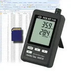 The Air Quality Meter or Humidity Detector precisely measures air temperature and relative humidity. This accurate and reliable device shows the current measurements on the large LCD display and saves the measurement data directly to an SD card (included). The Air Quality Meter is equipped with two channels, accommodates an SD card memory of up to 16 GB, offers an adjustable measurement rate / sampling interval, and includes a wall mount, making the device ideal for logging data over an extended period of time.