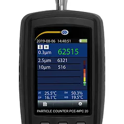 The dust measuring device PCE-MPC 20 is a particle counter that measures the particles in the atmosphere. The measurable particle sizes of the dust measuring device are 0.3, 2.5 and 10 μm. In addition to the particle counter function, the dust meter also measures the mass concentrations PM2.5 and PM10. The built-in high-performance pump ensures a sufficient flow rate at the dust measuring device. In addition, the dust meter can also measure the temperature, humidity and dew point.