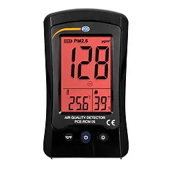 The PM2.5 particulate matter monitor PCE-RCM 05 is used to continuously measure the particulate matter content at the workplace. The PCE-RCM 05 PM2.5 monitor displays PM2.5 particulate matter as well as temperature and humidity on the display. The measuring range of the PCE-RCM 05 monitor ranges from 0 ... 500 μg / m³ PM2.5. This makes the PM2.5 meter an optimal test instrument to constantly have an overview of the fine dust content. Below the large measured value display of the PM2.5 content, the PM2.5 monitor provides quick information about the air quality with the aid of pictograms.