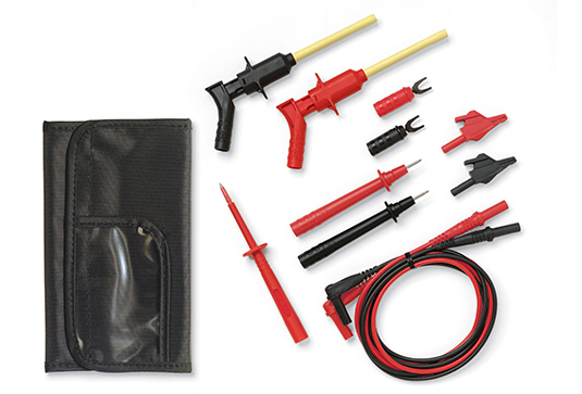 Amprobe DL248D Test Lead Kit includes 48″ long silicone lead wires, probe clips, spaced lugs, spring loaded crimp tips, red tip length extender and a fold out carrying case.
