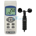 The LUTRON AM-4257SD is an anemometer with cup external probe, that can measure gas flow rate in range 0,9 - 35,0 m/s and temperature in range 0 - 50°C or -50 - 1300 °C by K-type thermocouple. This device is capable of storing measurements onto SD card and can communicate via RS232 or USB.