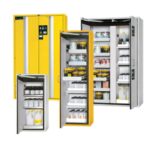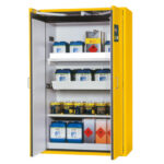Lemari penyimpanan keselamatan ini memungkinkan penyimpanan bahan berbahaya yang mudah terbakar tanpa batasan di area kerja, sesuai dengan standar EN 14470-1 dan TRGS 510.