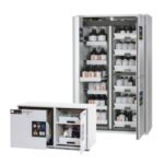 Penyimpanan bahan yang aman dan terpisah untuk asam, alkali, dan bahan kimia berbahaya yang mudah terbakar dalam satu lemari. Dilengkapi dengan dua kompartemen penyimpanan yang terpisah secara hermetis dengan dinding pembatas tahan api; sistem aerasi dan ventilasi terintegrasi; ketahanan korosi pada saluran udara tanpa logam.
