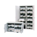 Lemari tinggi dengan bodi terbuat dari baja pelapis bubuk dan ruang interior terbuat dari resin melamin serta pelat khusus tahan api. Asam dan alkali dapat disimpan dengan aman dan terpisah. Dilengkapi dengan dua kompartemen penyimpanan yang terpisah secara hermetis; dinding pemisah vertikal atau horizontal; sistem aerasi dan ventilasi terintegrasi; ketahanan korosi pada saluran udara tanpa logam.