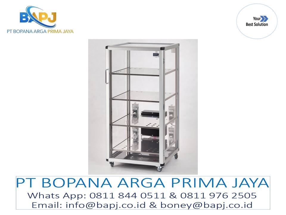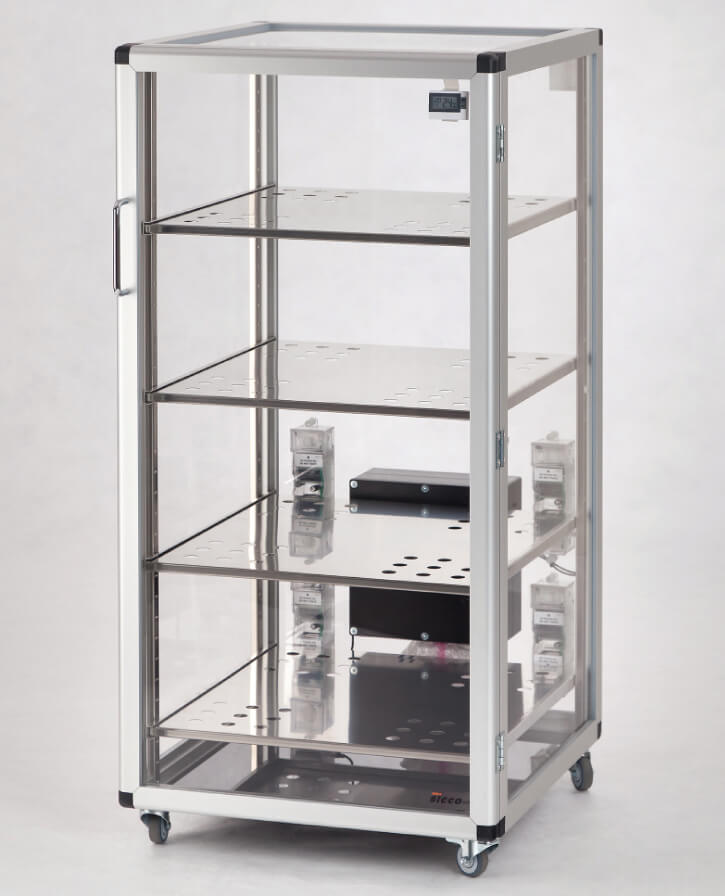 Desiccator dengan frame aluminium dan panel yang terbuat dari kaca akrilik, dilengkapi dengan empat rak stainless steel, higrometer, dan unit pengering yang terpasang. Terdapat empat roda (dua dengan rem) dan dapat digunakan hingga 17 rak. Diperlukan sambungan listrik 230 V / 50-60 Hz.