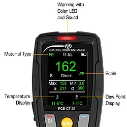 In addition to the coating thickness measurement, the Automotive Tester can measure the temperature and humidity of the environment. Thus, the Automotive Tester can be used to find out whether the climatic conditions are right to carry out further processing on the coating.