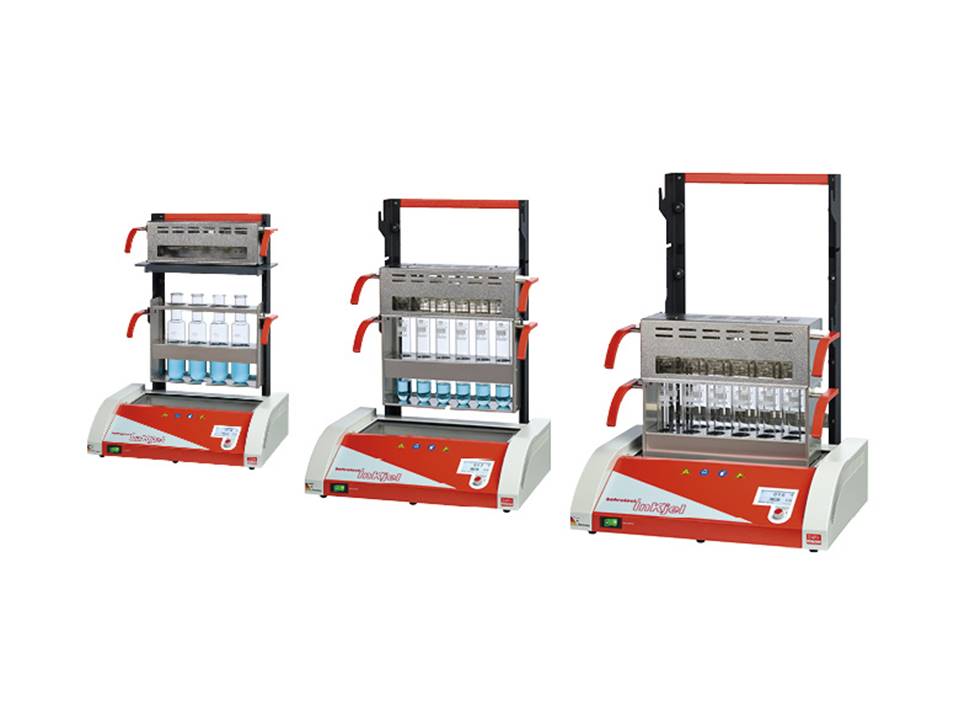 Hal ini juga berlaku untuk pengaturan baris ganda untuk rak untuk 12 sampel. Pembuluh pencernaan kaca ditangguhkan di rak dan tidak disimpan di bagian bawah unit pencernaan. Oleh karena itu, unit pencernaan tidak terlalu rentan terhadap kerusakan dibandingkan dengan blok pemanas aluminium.