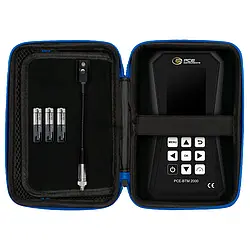 The belt tension meter is delivered completely ready for use. The scope of delivery includes the hand-held device, the standard sensor with gooseneck, a magnetic holder, batteries and operating instructions. An instrument case, frequency mallet, tripod and a measuring sensor with a spiral cable and a longer gooseneck (for hard-to-reach belts) are available as options for the tension meter.