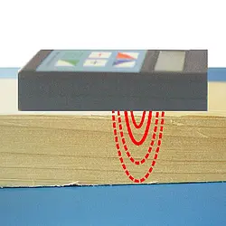 The building moisture meter determines moisture content by means of the capacitive method. In the building moisture meter an electromagnetic field quickly determines capacitance of wood. The moisture content in the wood is internally determined by means of a gross density.