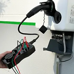 The car measuring device is specially designed for this application and already comes with a variety of functions. For example, all lines leaving the charging station are output individually via laboratory plugs. Thus, all lines can be tapped via the car measuring device. This allows the charging station to be checked for insulation with the help of the car measuring device. The car measuring device has a shock-proof plug connection. The RCD tester can be used to check the residual current device.