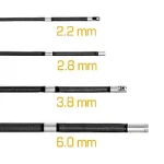 The 4-way system makes it possible to move the camera head from the car measuring device in a 190° bending radius. The viewing angle of the borescope is 120°. It is controlled via a joystick, which controls the electric motors on the boroscope. Thanks to the particularly narrow camera head with a diameter of between 2.2 and 6 mm, the borescope can be used for endoscopy in engines, firearms, bores and other narrow openings, for example. This means that weld seams, wear and tear and damage can be assessed quickly and easily with the boroscope in order to make quick diagnoses. The sheathing of the endoscope cable from the borescope consists of braided tungsten. The borescope camera head is made of titanium alloy. This makes the endoscope cable from the borescope particularly robust. The boroscope is therefore used in engineering offices, quality control and for expert opinions.