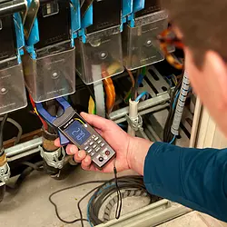 In the oscilloscope mode of the Clamp Current Meter, in addition to the direct and alternating voltage, the current can also be visualized as a graph. This has the advantage that the waveform of the current can also be displayed on the multimeter. Due to the bandwidth of 200 kHz in oscilloscope mode, the Clamp Current Meter, this measuring instrument can also be used to measure the current on frequency converters. All functions and areas of the Clamp Current Meter are protected against overload. The Clamp Current Meter is suitable for conductor diameters up to 35 x 46 mm.