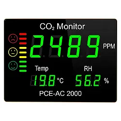 The NDIR CO2 sensor built in for the measurement has a measuring range of 9999 ppm. In addition to the high measuring range of the built-in NDIR CO2 sensor, the special feature of the CO2 measuring device is that the CO2 sensor does not require any maintenance. A temperature and a humidity sensor are also integrated in the CO2 measuring device in order to monitor the climatic conditions.