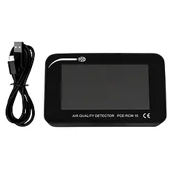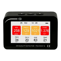The air quality meter PCE-RCM 16 is ideal for monitoring the air quality in homes, businesses or public buildings where people are staying. The 4.3-inch TFT display on the air quality meter is dimensioned so that all measured values ​​can be read directly. Supported measurements on the air quality meter are CO2, TVOC, PM1, PM2.5, PM10, temperature and ambient humidity. On the display of the air quality meter, the measured values ​​are updated every second. As soon as a measured value exceeds the fixed limit, this is visually indicated to the user.