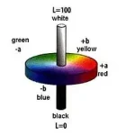 Here you can see the color space L*a*b. This color space covers all colors that are visible with the naked eye. L=100 stands for white and L=0 for black. "a+" and "a-" or "b+" and "b-" stands for the color contrasts red, green, yellow and blue.