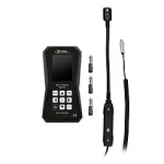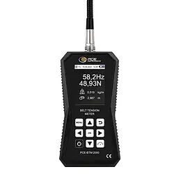 The belt tension measuring device is an optically measuring maintenance tool for determining the belt tension or belt tension force. This belt tension meter consists of a display device and a sensor head attached on a gooseneck. The advantage of the gooseneck is that the sensor head can be flexibly positioned. Due to the mobility of the gooseneck, the sensor can measure the belt tension (strand force) even in the inaccessible places. The belt tension measuring device measures the belt tension and the belt frequency of the belt in the standstill state. A small pulse on the belt, vertical to the tensioning direction, is enough to set the belt in motion. The belt tension measuring device detects with the sensor the natural frequency of the belt generated in this way and visualizes it on the display. The belt tension measuring device can directly determine the actual tension of the belt from the belt frequency and the optionally entered belt length and belt mass. However, entering this data is not necessarily required in order to carry out the measurements directly with the belt tension measuring device. The measurement units in the device can be switched between N (SI unit) and pound force (US unit). The reading is always shown as the belt frequency in Hz on the graphic display of the belt tension measuring device. If the belt mass and length are entered in the device, the strand force is also displayed in Newton. The intuitive graphic menu is visualized on the high-contrast display of the belt tension measuring device in six selectable languages. The belt tension measuring device is equipped with a memory for further analysis and for quality assurance purposes. Up to 750 data records can be stored in the memory of the belt tension measuring device. The belt tension measuring device is delivered completely ready for use. The scope of delivery includes the handheld device, the standard sensor with gooseneck, a magnetic holder, batteries and operating manual. To increase the flexibility during the measurement, the following items are optionally available to the belt tension meter: a device case, a frequency mallet, a tripod and an external sensor head with a spiral cable.