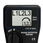 The rotating field indicator shows the direction of rotation on an LCD display. Furthermore, the display of the rotary field indicator shows whether a phase has been connected to the measuring lines or not. The measuring cables of the rotating field indicator are equipped with crocodile clips so that the measuring device can be connected directly to cables or screw contacts.