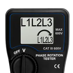 Rotary field indicator with voltage tester / Two LCD displays / Voltage measurement up to 600V / Test leads with crocodile clips