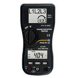 The rotating field indicator PCE-PI 10 is used to determine the direction of rotation of 3-phase voltage networks. Furthermore, the rotating field indicator is able to measure voltages up to 600V AC / DC. The rotating field direction is important for machines and plants. If the phases are not connected correctly, damage to connected motors and pumps can occur, for example.