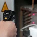 To switch on the infrared temperature measuring device, the measuring button must be pressed. The measurement is then immediately taken by the infrared temperature measuring device. If the button is released, the last value remains on the display of the infrared temperature measuring device until a new measurement is carried out. Optionally, the infrared temperature measuring device can be equipped with an ISO calibration certificate.