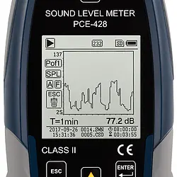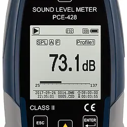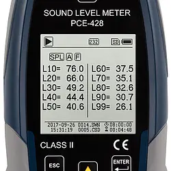 The condition monitoring sound level meter is an optimal sound level meter for measurements at workplaces, construction sites, in traffic, airports, etc. The sound level meter is a class 2 device and is equipped with an octave band frequency filter. The sound level meter can optionally be upgraded with a 1/3 octave band filter. In addition to the numerical display of the measured value, a graph can show the course of the sound level. The sound level meter has various frequency weightings such as A, B, C and Z. The sound meter can also display measurements with the time weightings Fast, Slow, Impulse and Peak. The measuring range of the sound level meter extends from 25 ... 136 dbA at a frequency of 20 Hz ... 12.5 kHz. 3 different measurement profiles can be stored in the sound level meter. Here the user can decide which parameters the sound level meter should record. For example, you can choose between Laeq, LcPeak, LaFmax, LaFMin, etc.