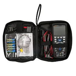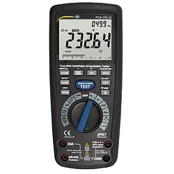 This digital multimeter PCE-ITM 20 combines a versatile multimeter with an insulation tester. In addition to the usual measured quantities such as voltage, current and resistance, this digital multimeter PCE-ITM 20 is also equipped with a frequency and capacitance measurement. A thermocouple included in the delivery can also be used to measure the temperature. Automatic range selection (Autorange) allows fast and safe operation with the isolation multimeter, while the large backlit LCD display ensures good readability.