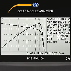 The LCD display of the environmental meter has a size of 4.8“. This means that the characteristic curve and all measured values ​​can be read off at the same time. In order to analyze the characteristic curve better, each individual measuring point on the photovoltaic meter can be approached. For a different view of the X and Y axes, you can switch between current, voltage and power by pressing a button on the photovoltaic meter.