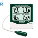 The Extech Big Digit Hygro-Thermometer simultaneously displays indoor and outdoor temperature and humidity. It measures humidity from 10% RH to 99% RH ± 5% RH and temperature from -10°C to 60°C ± 1°C (14°F to 140°F ± 1.8°F). A max/min with reset function stores and recalls high and low measurements for all 4 parameters. Complete with built-in stand, wall mounting bracket, outdoor sensor with 89 cm (35 in) cable, and 1.5 V AAA battery.