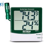 This Extech Big Digit Hygro-Thermometer has an extendable probe with a 45.7 cm (18 in) cable. It measures humidity from 10% RH to 99% RH ± 4% RH and temperature from -10°C to 60°C ± 1°C (14°F to 140°F ± 1.8°F). This meter also includes maximum/minimum and rest functions, as well as having a rear calibration adjustment post with optional RH calibration bottles. Comes complete with built-in stand, mounting bracket, sensor, and 1 AAA battery.