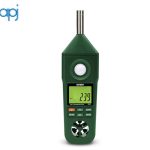 The EN300 Measures Humidity, Temperature, Air Velocity, Light and Sound. Rugged 5-in-1 environmental meter with tripod mount and RS-232 PC interface. Large dual LCD simultaneous display of Temperature and Air Velocity or Relative Humidity. Characters on display reverse direction depending on Hygro-Thermo-Anemometer or Light-Sound Mode. Data Hold, Min/Max, Auto power off, Low Battery/Overrange indication. Built-in low friction vane wheel improves accuracy of air velocity in ft/min, MPH, m/s, km/h, and Knots. Built-in precision thin-film capacitance humidity sensor for fast response. Built in thermistor for ambient temperature measurements. Type K input measures temperature to 2372° (1300°C). Utilizes precision photo diode and correction filter for Cosine and color corrected light measurements. Sound Level measurement meets IEC 61672 class 2 using A frequency weighting and fast response time. Complete with Type K thermocouple probe, pouch case, and six 1.5V AAA batteries.