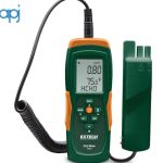 The Extech FM200 is a handheld Formaldehyde Meter with a detachable probe. This meter simultaneously displays formaldehyde (CH₂O) concentration, air temperature, and relative humidity readings on a large, LCD backlit display. The FM200 features CH₂O calibration function in fresh air, min/max, data hold, auto power off, and low battery indicator functions. Comes complete with a soft tube, sensor with a 64 cm (2.1 ft) cable, 6 AAA batteries, user's manual, and a carrying case.