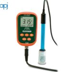The Extech PH300 pH/Temperature Kit measures pH, mV, and temperature at your workbench or in the field. It has automatic, one button calibration of 4, 7 and 10 pH with a choice of three point calibration, for better accuracy and automatic temperature compensation. Memory stores up to 200 readings with series number, measured value, and temperature. The meter has a large, blue, backlit LCD display screen with an auto power off function plus disable function that saves battery life. The IP57 waterproof housing protects it from moisture and the elements. Comes with a pH/mV/temp electrode, a protective rubber holster, the pH calibration solutions (4, 7, and 10 pH), two AA batteries, hard carrying case, and user manual.
