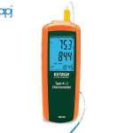 The Extech TM100 Type J/K Single Input Thermometer has a wide temperature range of -200°C to 1372°C (-328°F to 2501°F) for Type K measurements and -210°C to 1100°C (-346°F to 2012°F) for Type J measurements. It has a high 1°C/0.1°F resolution, as well as a large backlit LCD display with readouts in °C, °F, or Kelvin. The data hold function freezes the reading on the display and the screen displays the max/min/avg. Readings capture a relative time stamp. Also, the offset key is used for zero function to make relative measurements. Comes with anuto power off with a disable feature. This thermometer comes complete with the Type K bead wire temperature probe and one 9 V battery.