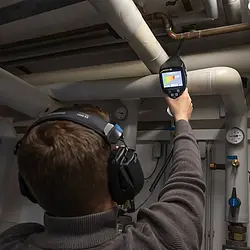 The gas detector picks up this ultrasound via the sonic funnel and converts the inaudible ultrasound into audible frequencies. The laser pointer built into the leak detector enables the leak to be precisely targeted. The leak detector's horn has been designed to be able to pick up sound waves and focus them in such a way that it acts like a directional microphone and suppresses other noise.