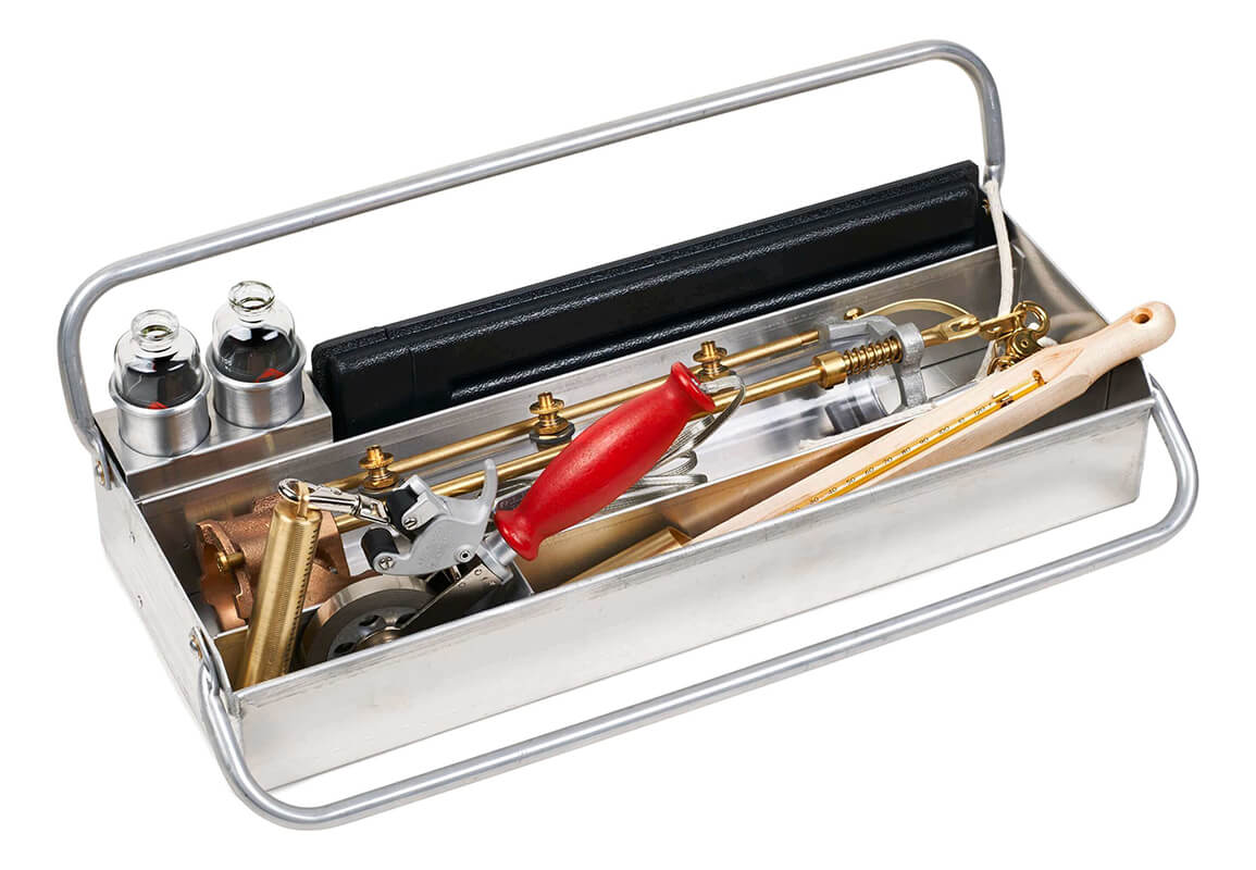 The Robinson Gauger’s Tray is constructed from welded sheet aluminum making it lightweight, durable, and corrosion-resistant. The tray has storage space for all the necessary gauging equipment, including an oil thief, a tank thermometer, a gauging tape and plumb bob, hydrometers, and centrifuge sample tubes. Built-in dividers keep your supplies neatly organized and the open-top design keeps equipment easily accessible. Centrifuge tube holders can be included with the tray upon request.