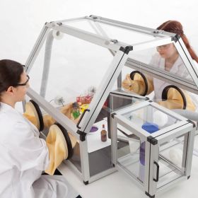 SICCO Glove Boxes memungkinkan pekerjaan yang aman dengan senyawa sensitif dalam lingkungan yang terkontrol. Sarung tangan karet alami memberikan mobilitas yang diperlukan untuk penanganan yang aman. Konektor untuk pengisian gas memungkinkan pembersihan ruang kerja serta ruang transfer, sehingga box sarung tangan ini dapat dengan mudah dimuat.