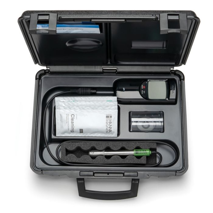 | Ordering Information | HI991001 is supplied with HI12963 pH probe with internal temperature sensor, HI70004 pH 4.01 buffer sachet (20 mL x1), HI70007 pH 7.01 buffer sachet (20 mL x1), HI700601 electrode cleaning solution sachet (2 x 20 mL), 100 mL beaker (1), calibration certificates for both meter and probe, batteries, instructions, and rugged thermoformed carrying case. |