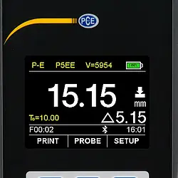 The measured values ​​are displayed directly on the easy-to-read TFT color display. Due to the internal memory, which can be read out via the optionally available software, different measuring points can be clearly stored. The non-destructive ultrasound measuring method enables the measurement even on end products. Thanks to the Echo-Echo working mode, even coated workpieces can be measured (only with PCE-TG 300-P5EE sensor).