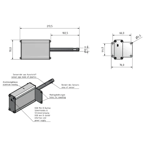 LF-TD-U transmitter for maximum temperatures of 60°C with USB interface for laboratory, climate conditioning and drying technology, wood processing, food and animal feed industry, building industry, printing and paper industry, agriculture, biotechnology and pharmaceutical industry.