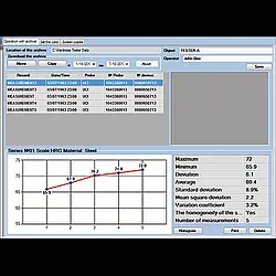 After measuring the hardness of a component, the UCI hardness tester PCE-3500 shows different statistical values such as the MAX / MIN values and average values. Moreover, the standard deviation and further coefficients can be determined. A bar chart can be indicated. Since the UCI hardness tester is equipped with an internal memory, the measured data can be evaluated by means of a software.