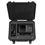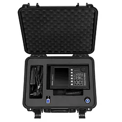 With adjustable frequencies between 0.5 ... 20 MHz and sound velocities between 1000 ... 15000 m/s, measurements can be carried out in steel in the range between 0 ... 10000 mm. DAC and AVG evaluation methods, display and probe delay, attenuation and amplification functions, export and report generation functions as well as numerous other setting options make non-destructive material testing with the material tester considerably easier. The tester has a video recording of the screen. The software can then be used to call up the data and create a report. The setting parameters can be changed using the rotary knob. The 5.7-inch colour display provides a clear presentation of the test results.