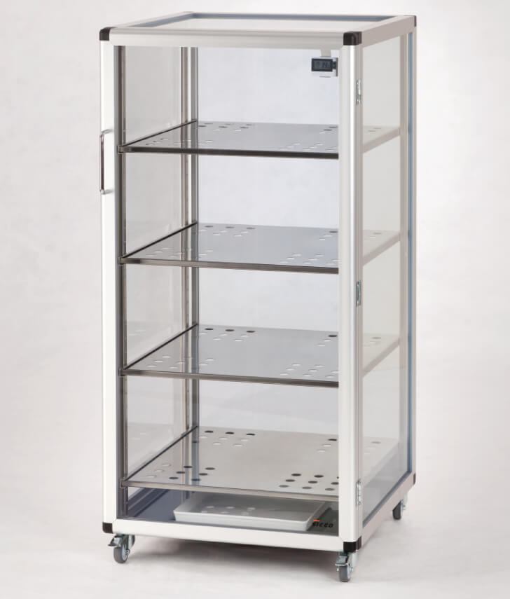 Kasa aluminium dengan panel dissipatif statis terbuat dari polikarbonat, dilengkapi dengan empat rak dari stainless steel, nampan, dan higrometer, empat roda dengan tapak dissipatif statis (dua di antaranya dilengkapi rem), dapat digunakan dengan hingga 34 rak. Semua bahan yang digunakan dapat menghilangkan muatan elektrostatik melalui kabel pembumian yang dapat dihubungkan di bagian belakang (ulir penghubung M6).