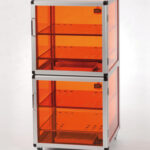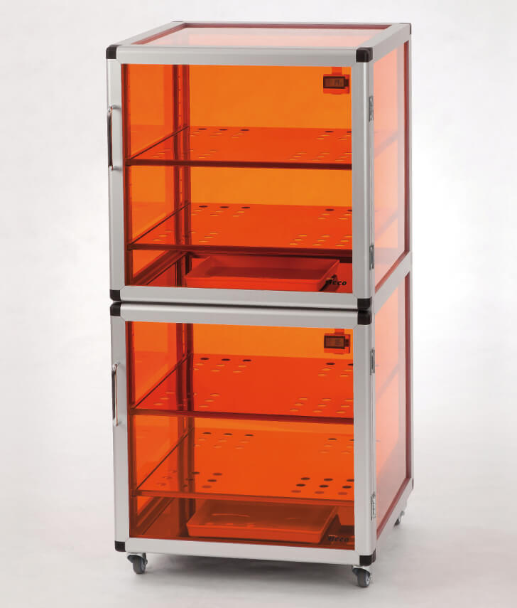 Rangka aluminium dengan panel oranye terbuat dari akrilik yang mengurangi masuknya cahaya dan melindungi terhadap radiasi ultraviolet, dilengkapi dengan dua kompartemen dan dua pintu. Termasuk empat rak stainless steel, dua nampan, dua higrometer, dan empat roda (dua di antaranya dengan rem), dapat digunakan dengan hingga 8 rak per kompartemen.
