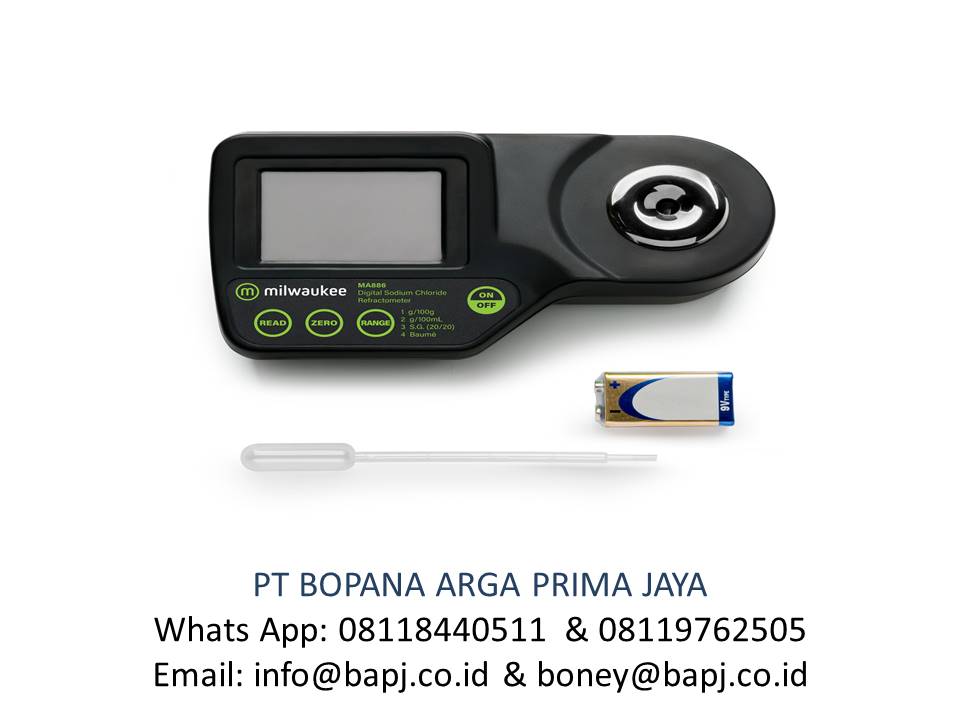 The MA886 digital refractometer uses the refractive index to determine sodium chloride concentration in aqueous solutions used in food preparation. The MA886 is not designed for measuring salinity in sea or aquarium water. Use MA887 for this application.