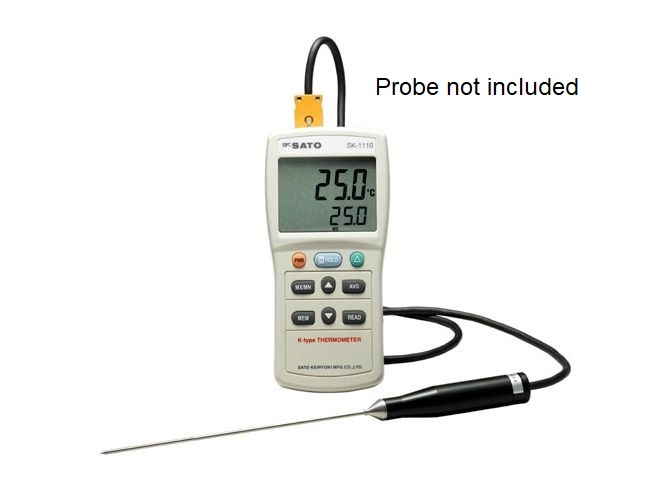 SK-1110 is a digital thermometer with a large LCD available with various probes for different applications. One probe must be purchased separately. Probes can be interchangeably used with those of SK-1100.