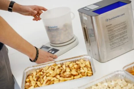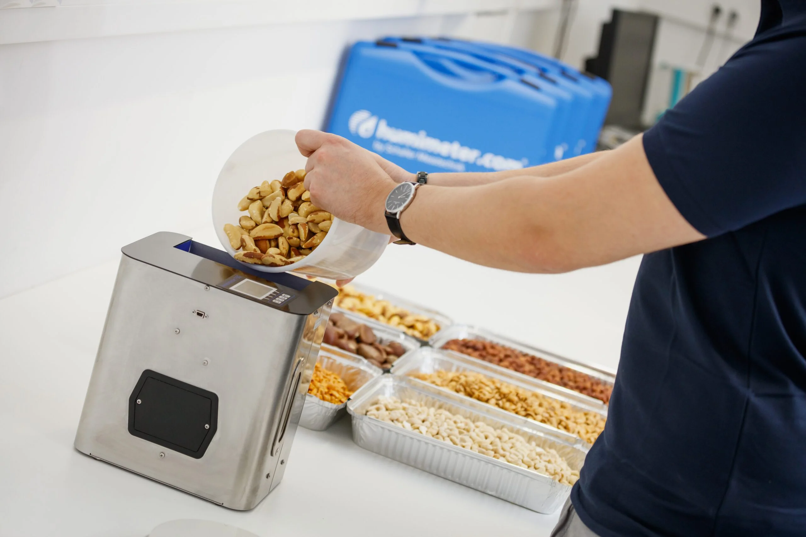 Conscientious and accurate control of the water content of nuts is an essential part of quality assurance. With the humimeter FSG this process is carried out quickly and precisely. In practice, the high-quality measuring device is used along the value chain. From the harvest on a sustainable Fairtrade nut plantation in India or a peanut plantation in the USA to the processing and storage for onward transport as well as the incoming inspection before shelling and roasting to the packaging of the end product, all quality control is carried out with the humimeter FSG.