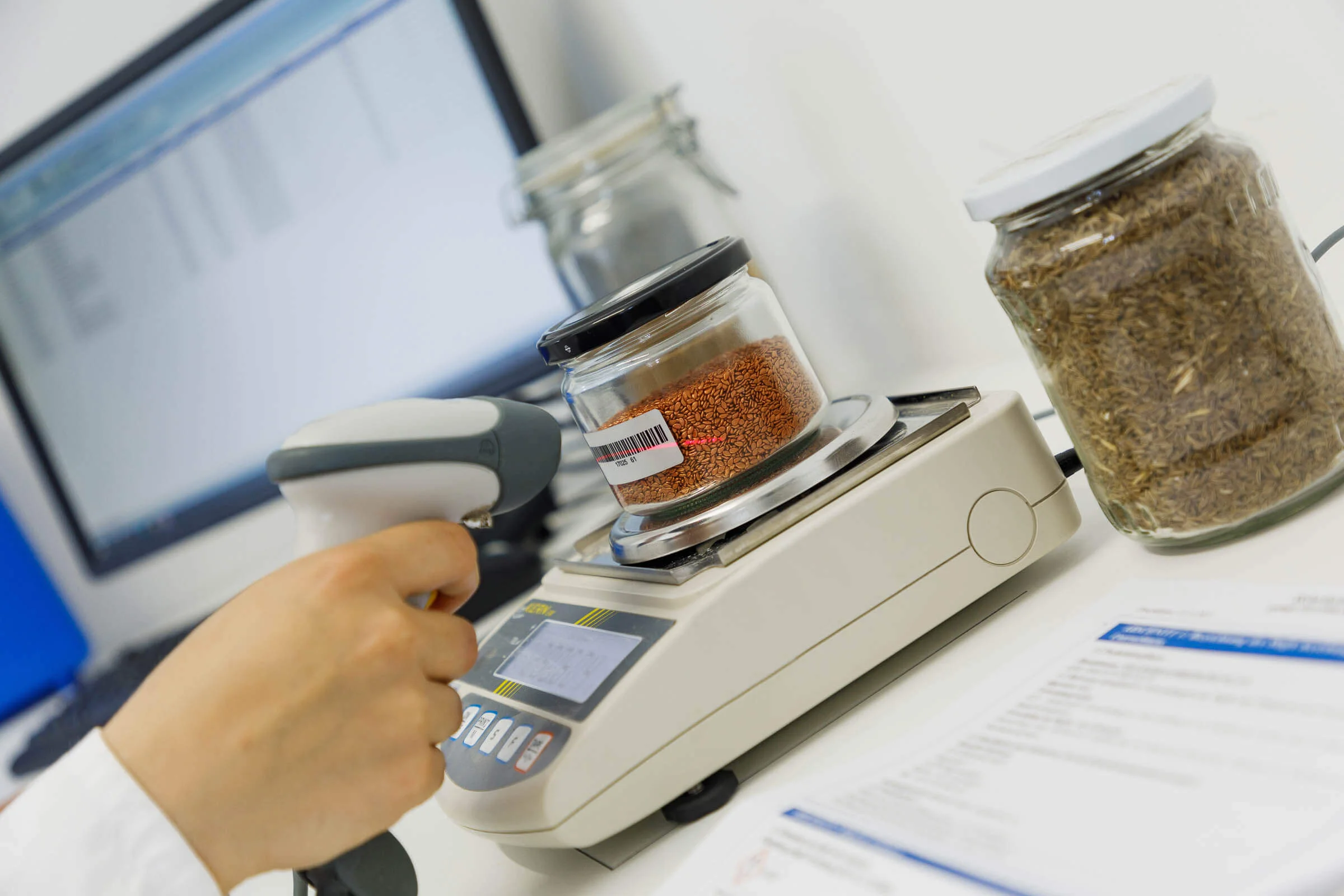 By the automatic laboratory moisture analysis using barcodes, barcode scanner and analysing scale with PC interface, the risk of errors in the writing and reading of data is eliminated.