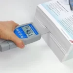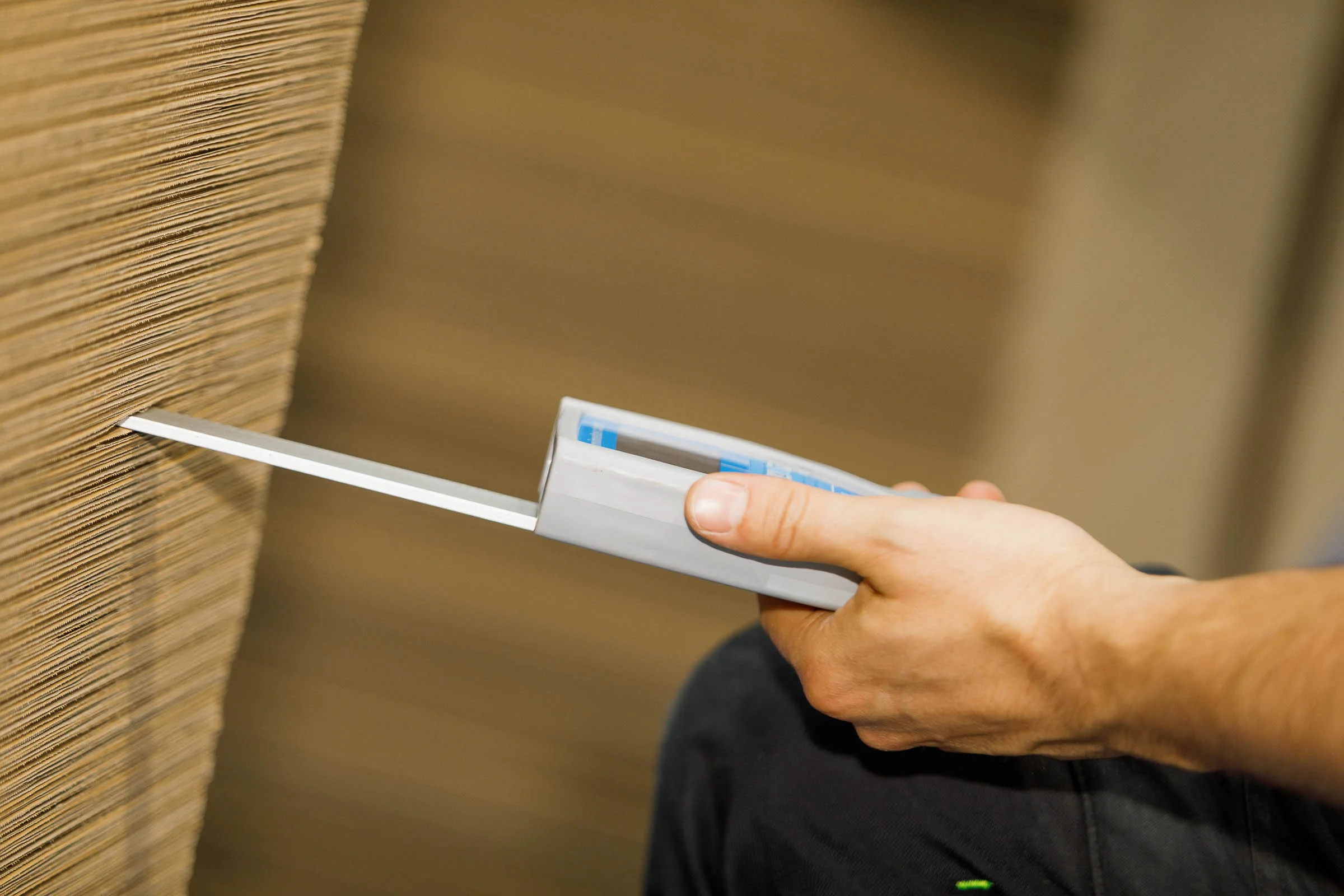 In order to prevent a damage of the sword sensor when using the humimeter RHXNUMX paper moisture meter in heavy paper stacks, a sword sensor holder and a tool for removing the sword sensor holder are available optionally. Before inserting the humimeter RHXNUMX paper moisture meter, the sword sensor holder is driven in the paper stack and enables a measurement without any falsification of the measuring value. For an easy removal of the sword sensor holder after drawing out the humimeter RHXNUMX paper moisture meter, the tool for removing the sword sensor holder is used. Simultaneously, the humimeter RHXNUMX paper moisture meter also measures the material temperature and includes it in the calculation of the measuring result. The temperature range goes from -XNUMX °C to +XNUMX °C and can be set to °C or °F as required.